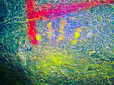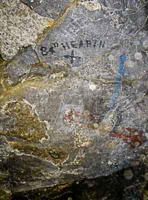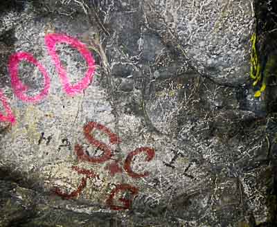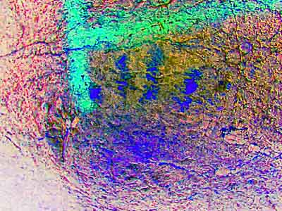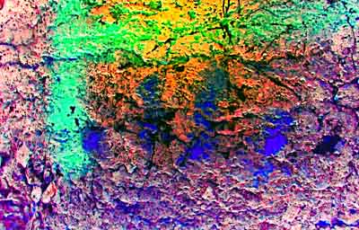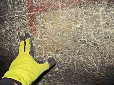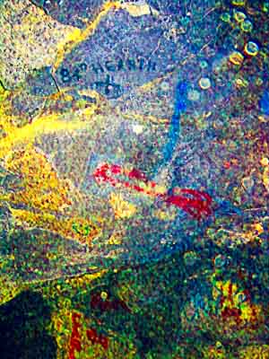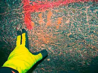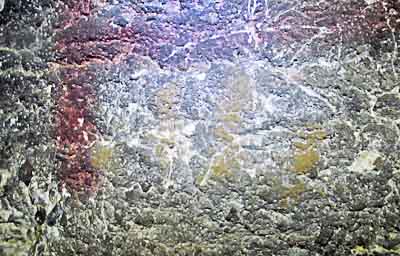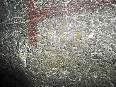 This is a good example of when processing can help identify possible historic marks on the graffiti covered walls. The paints in this example were obviously of a different type and the processing significantly enhanced the yellow color, which is similar to the ocher dust in the cave. |
