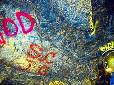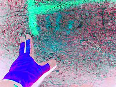 This photo enhancement process is called DStretch or ImageJ which is an "applet" that can provide false color replacement in some instances which can help bring out certain features. The JAVA applet requires you to have Java script on your computer which is often updated. (The older version I was using to make the images below on a 64-bit Mac had a problem with long file names that I saved.) But the links above will guide you to the latest software version for your particular system. The program has so many processing parameters that when you get a "good" result on your particular picture, be sure to "save as" a copy which usually adds some of the parameter initials to the saved file name which will help you duplicate your results on similar photos in the future. There is a bit of a learning process here so take careful notes on what works best for your photos. The set of pictures below give a good example of the value of this process. In 2013 Mike Bilbo was using a "special light" in the cave to help him look for possible historic signatures. He thought he could see a hand print under some graffiti and took some photos which are processed below. Now the question is "was this a historic hand print, or a more recent print?" This is the challenge for the archaeologist that is tasked with removing the graffiti without harming the historic material under the modern spray paint. |