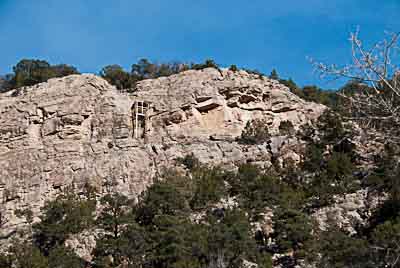 Sandia Cave is located in the east wall of Las Huertas Canyon in Madera Limestone of Pennsylvanian age (circa 300 million years ago. (~300 MA). Look for the spiral staircase which marks the entrance near the top of the canyon wall..
