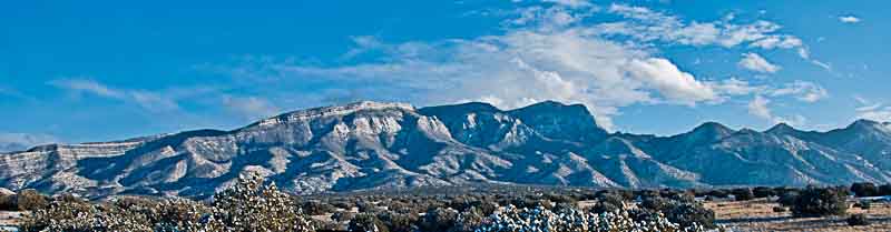 This view looking East from Placitas, NW of Sandia Peak, shows the layered Madera limestone on the top of the mountain just to the left of the center of the picture. Sandia Cave is located in Las Huertas canyon "just over the top" of the mountain. |