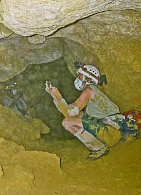 Despite its cultural and historical significance and popularity as a tourist destination, the integrity of the cave has diminished over the past several years. The mouth and the area just beyond the mouth of the cave are heavily and repeatedly vandalized. The entrance area of the cave is severely sooted and blackened from fires illegally lit in its interior. There is extensive spray-painted graffiti (and litter) inside the cave and at selected spots on the trail. This graffiti potentially obscures valuable information located on the rock surface. If left untreated, it can also bond to and damage underlying rock surfaces over the long term. Visitors to the cave are advised to wear proper caving equipment if venturing past the small wall located 40 feet inside the entrance. As seen in these photos taken when the cave was surveyed in 2007, dust masks, kneepads, and of course helmets with lights should be worn as the cave is extremely dusty. Slow movement through the passages by small groups will minimize the dust. Visitors with breathing or lung issues should not go beyond the top of the spiral staircase. Do not start any fires in the cave and please help remove any trash that others have thrown down before your visit. |